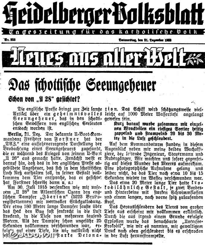 В прошлую субботу в разделе «Жизнь и письма» была опубликована рецензия на книгу Гарольда Уилкинса «Тайны Великой войны», где автор упоминает появление морского змея, увиденного командиром немецкой подводной лодки, торпедировавшей корабль «Iberian». Думаю, я могу иначе взглянуть на этот вопрос. Несколько недель назад я был пассажиром на корабле «Centaur», идущем на север от Фримантла, а моим соседом по каюте был немецкий путешественник, направлявшийся в Батавию, мистер Вегенер. Во время наших разговоров он рассказал историю о морском змее. У Вегенера есть близкий друг, который во время войны был командиром немецкой подводной лодки. Этот командир, читая недавно о чудовище Лох-Несса, решил подшутить над немецкой публикой. Он написал в газеты, что во время войны, сразу после того, как «Iberian» затонул, он взорвался под водой и в воздух поднялся морской змей… Публику красиво обманули. Очевидно, обманули и автора вышеупомянутой книги, так как он включил его байку без каких-либо оговорок. За эту историю поручился г-н Вегенер, и я уверен, что он подтвердит мое заявление [5].