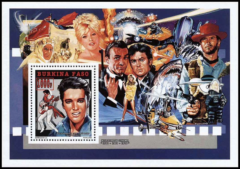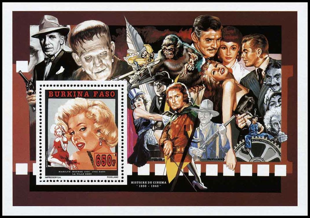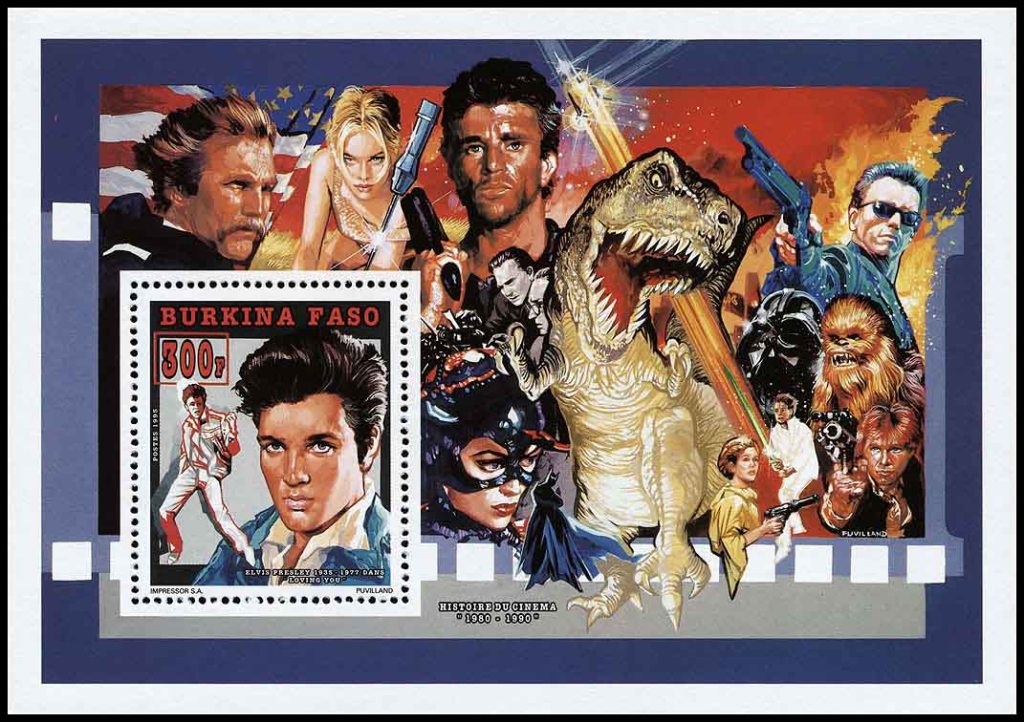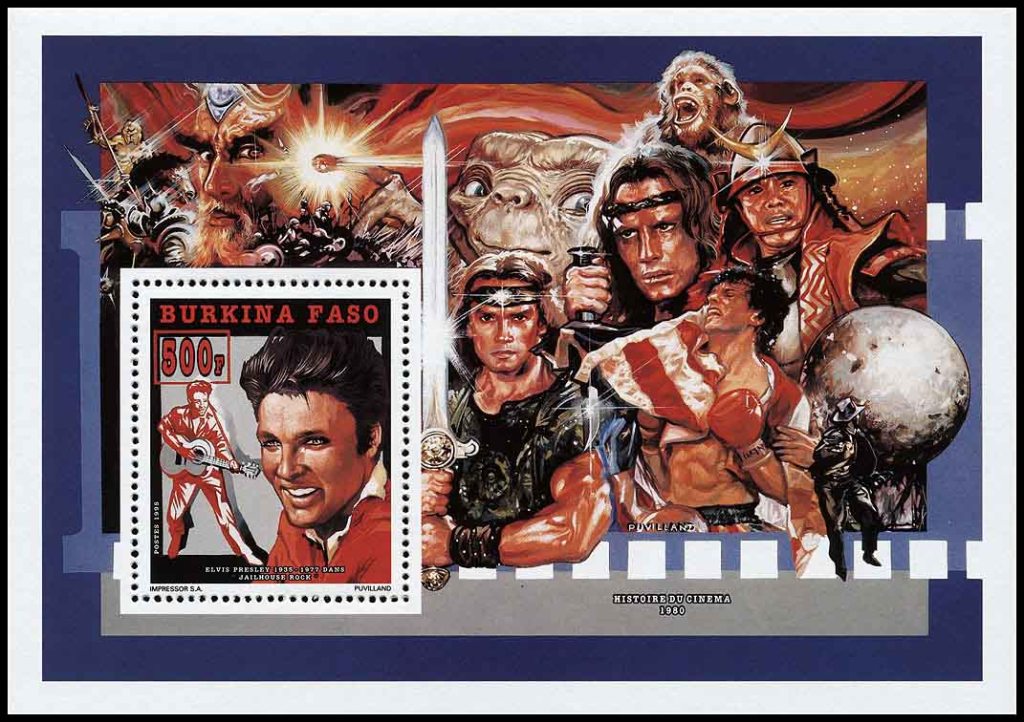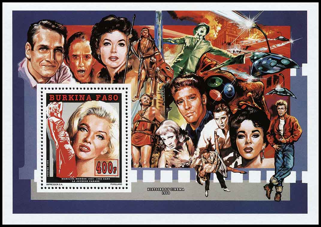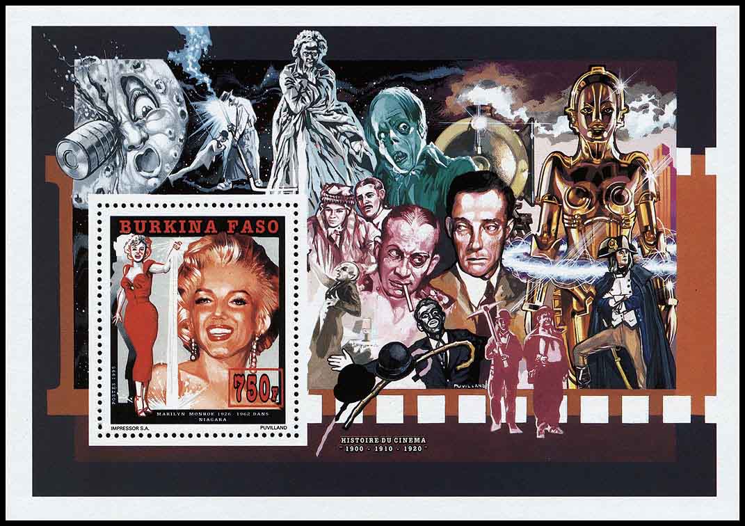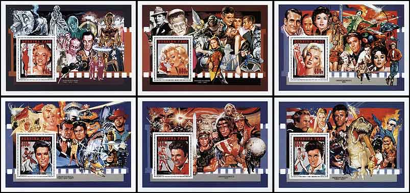 24 февраля 1995 года для африканского государства Буркина Фасо было выпущено несколько почтовых серий, приуроченных к столетию кинематографа. Первый выпуск посвящён Элвису Пресли и состоит из трёх марок и трёх блоков, второй посвящён Мэрилин Монро (в этом выпуске также три марки и три блока). На рисунках этих марок и блоков нет ничего фантастического. Но марки, помимо марочных листов, были выпущены в виде люкс-блоков, на красочных полях которых изображены сцены из кинофильмов, в том числе и фантастических.