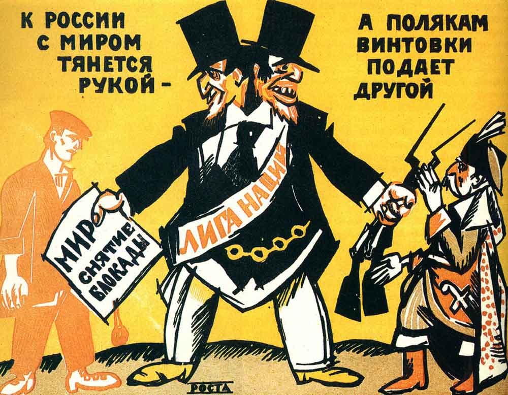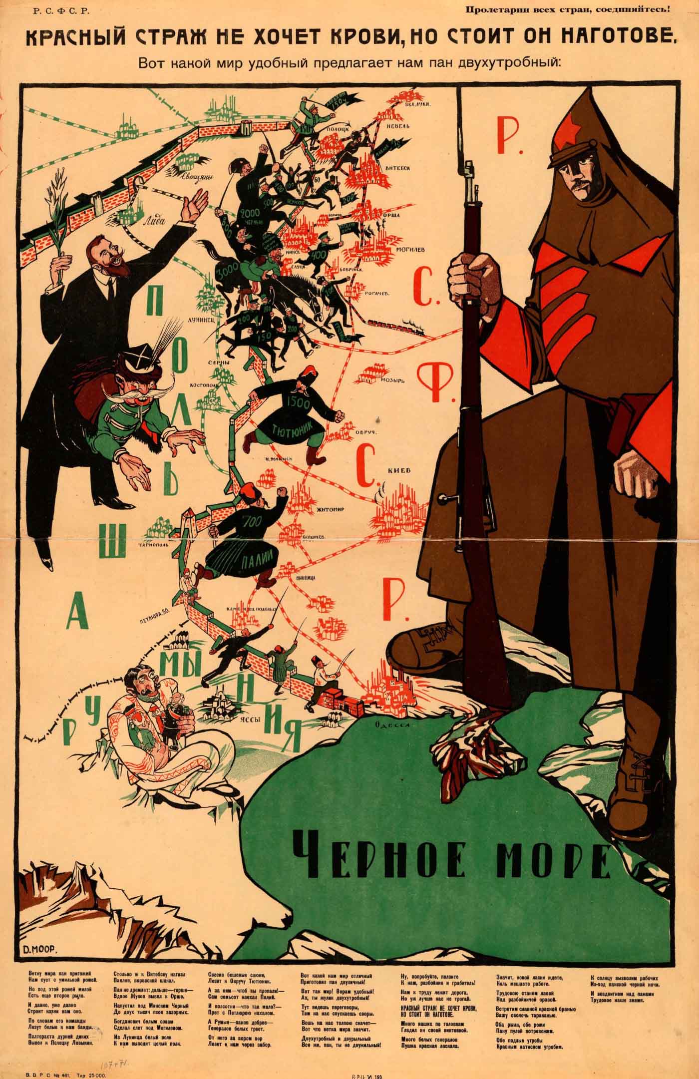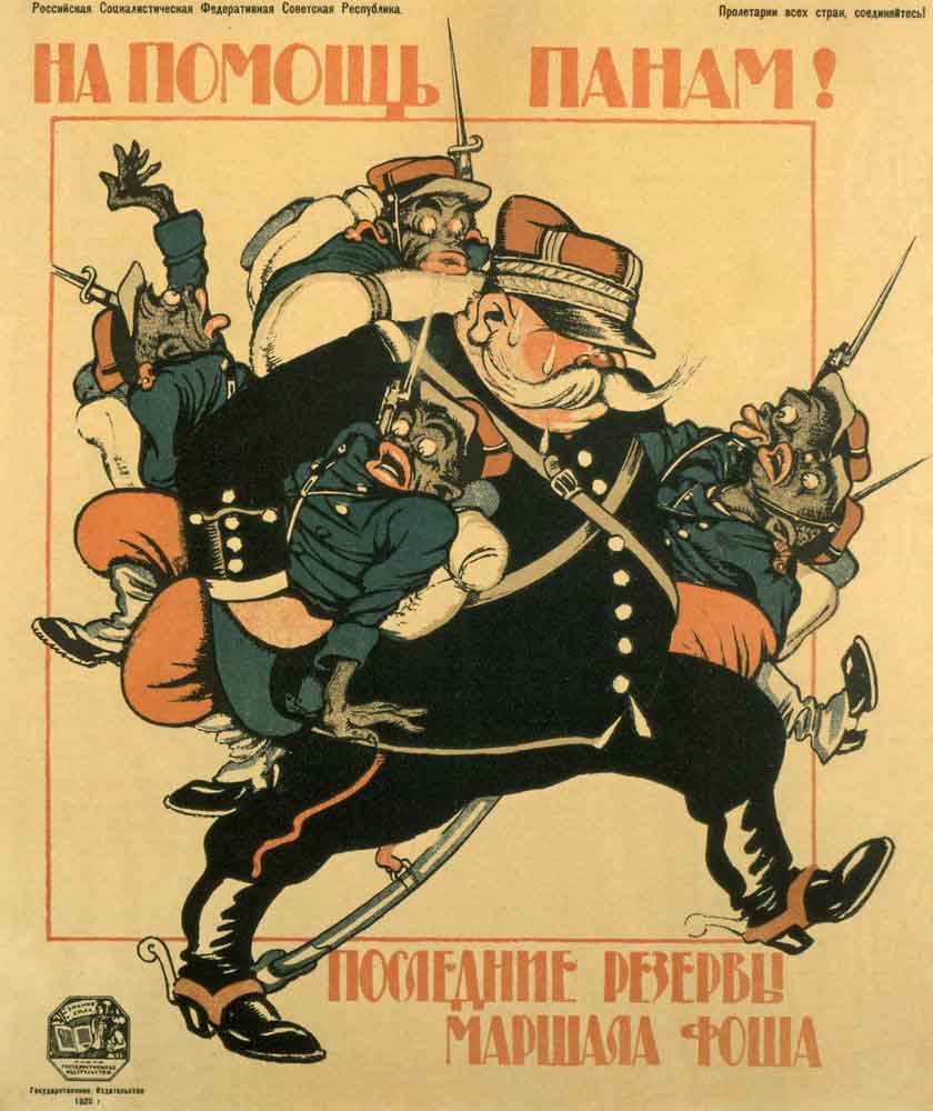 И этот плакат знаменитого Дени тоже совсем не политкорректен: французский маршал Фош стремится спасти «буржуазно-шляхетскую Польшу» якобы при помощи зуавов, «черных дикарей», натравливаемых на белых красных. Подобный мотив часто встречается в тогдашнем агитационном искусстве: мол, и революция, и предшествующая ей Первая мировая, и последующая Гражданская — все-таки «дело белых людей», позор империалистам, превращающим классовый конфликт в расовый! Еще не наступили годы, когда советские плакатисты будут восторженно изображать мускулистых светлоликих чернокожих, триумфально побеждающих темные силы в лице карикатурных белых карликов…