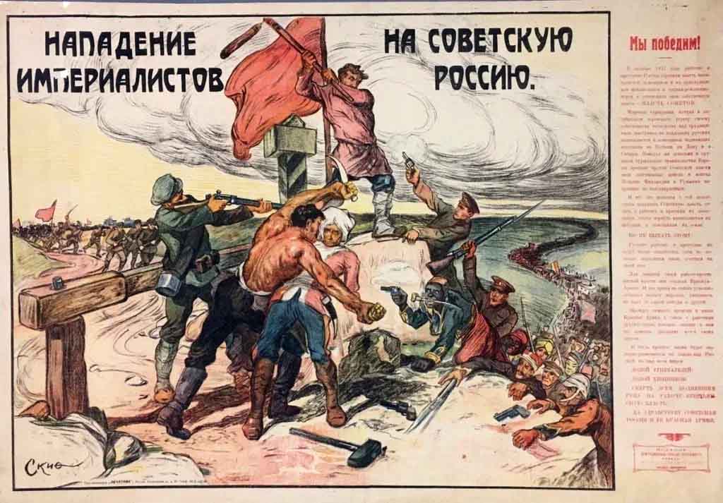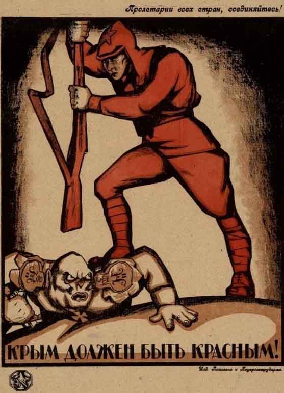 Опять все до крайности нетолерантно: против защитников Советской России выступает подлинный интернационал, а среди красных — ни одного черного или хотя бы желтого, не говоря уж о голубых и розовых… Между прочим, зуав с ятаганным ножом в зубах — явный «перевертыш» распространенного в европейской пропаганде «большевика с ножом в зубах» (которому западные плакатисты, тоже к толерантности не склонные, регулярно придавали то семитские, то китайские черты, объединяя «желтую опасность» с красной).