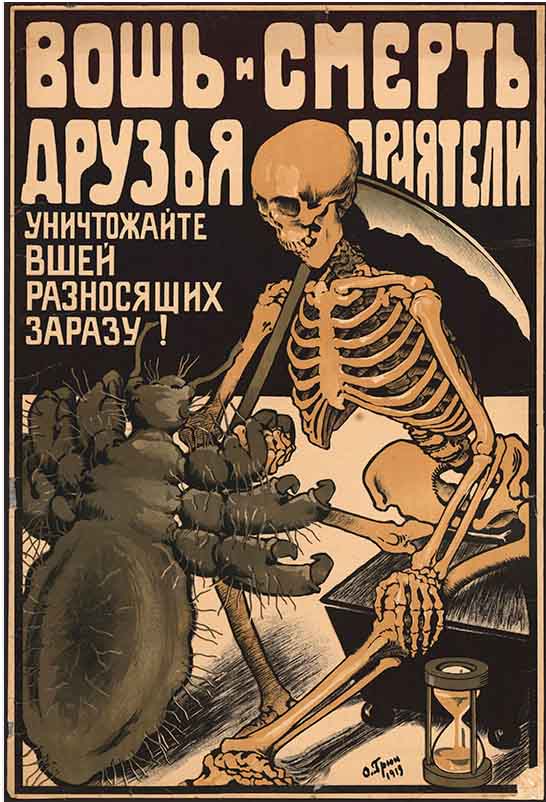 И все-таки главным (притом ОБЩИМ, не различающих красных и белых!) врагом на Гражданской были болезни, при разрухе здравоохранения унесшие больше жизней, чем пало от оружия. Этот плакат вышел в Харькове 1920 года, поэтому двуязычие не должно удивлять (потом будут переиздания, где языковая норма начнет смещаться…). Автор явно был человеком грамотным, ориентировавшимся на образ не только вшей, но и уэллсовских марсиан. А среди щедро рассыпаемых ими «монстров» преобладают холерные вибрионы (в данном случае сделавшиеся более похожими на сперматозоиды), но и прочего добра хватает, вплоть до гонококков и спирохет…