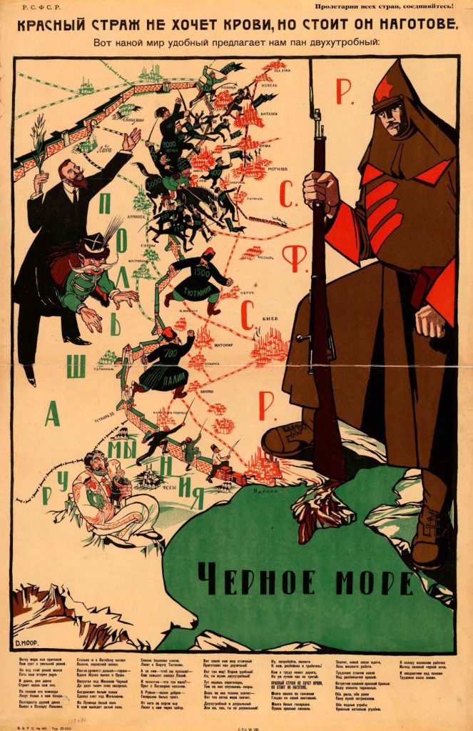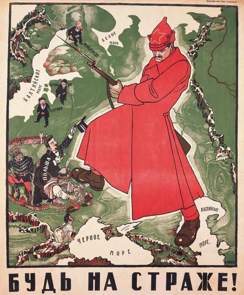 Автор этого красного стража — знаменитый плакатист Дмитрий Моор (Орлов). Автор подрисуночного текста не указан, но это точно не Маяковский, причем НАСТОЛЬКО не Маяковский, что, хотя мы и нашли версию плаката с высоким разрешением, позволяющим разобрать стихотворные строки, не прилагаем их: там вправду нечего читать.