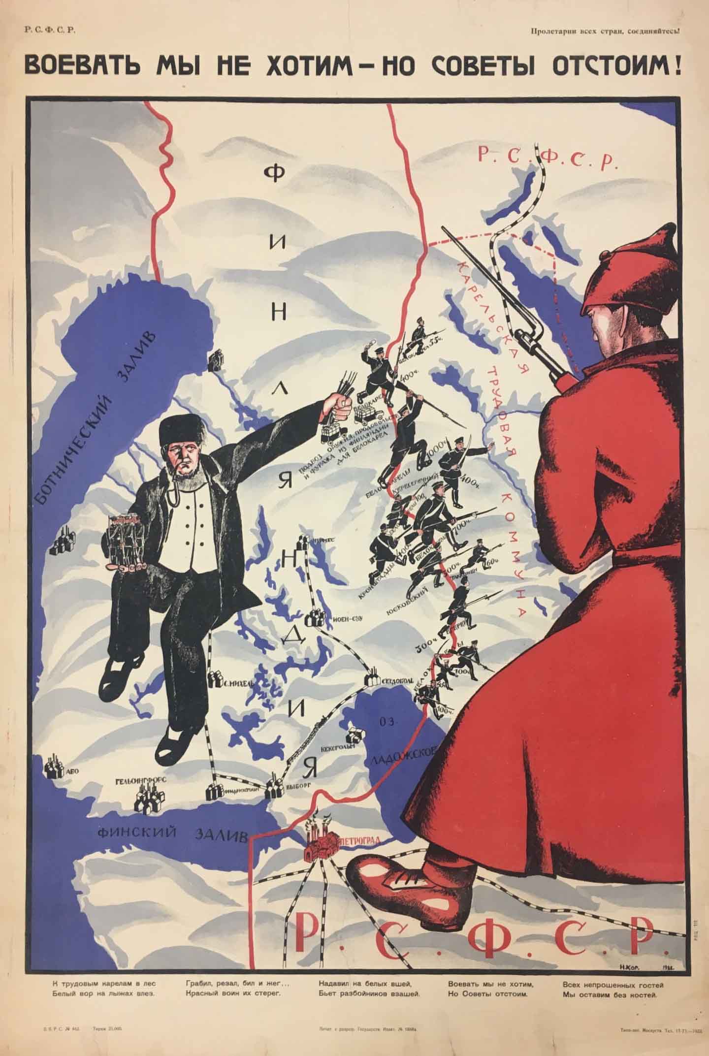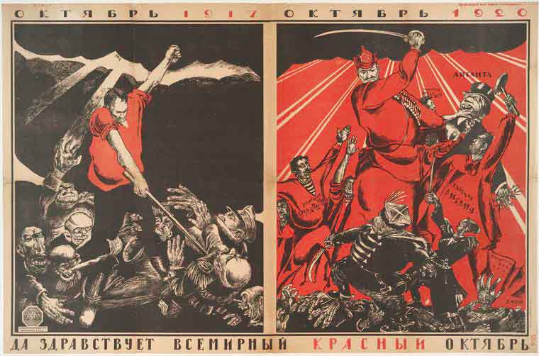 Словно бы афиша двухсерийного фильма, повествующая о борьбе с зомби. Особенно левая половина, отчаянно-трагическая, описывающая «старт» событий в 1917/18 году. Впрочем, и справа, в уже почти совсем триумфальном октябре 1920-го, неудачная компоновка позволяет трактовать троцколикого (Лев Давидович по-прежнему главком!) красноармейца как находящегося в окружении зомби: рабочая Англия с пролетарским молотом и революционная Франция в матросской тельняшке хотя и «покраснели», но, кажется, намерены наброситься скорее на него, чем на «черных» белых. Польский пан по-прежнему карикатурен, зато Врангель наконец похож на себя. А вообще-то на всех таких плакатах не устаешь удивляться отваге карликовых врагов, героически бросающихся со своим смехотворным оружием на окруженного могучей свитой победоносного великана, только что изничтожившего кучу их предшественников и явно не намеренного останавливаться…