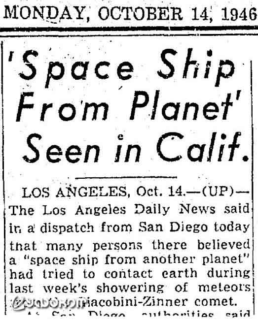 Между 7:25 и 9 часами вечера 9 октября 1946 года жители Сан-Диего и окрестностей увидели загадочный объект. Люди говорили, что у него было длинное тело, напоминающее пулю или фюзеляж самолета, с двумя огромными крыльями, как у летучей мыши. Оно было черным, а на борту горели два красных огня.