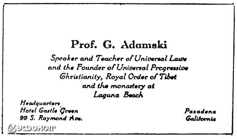 «Число его учеников стало исчисляться сотнями, — писала поклонница Адамского Шарлотта Блоджетт. — Просьбы выступить с лекцией приходили со всей Южной Калифорнии, его выступления передавались радиостанциями в Лонг-Бич и Лос-Анджелесе».