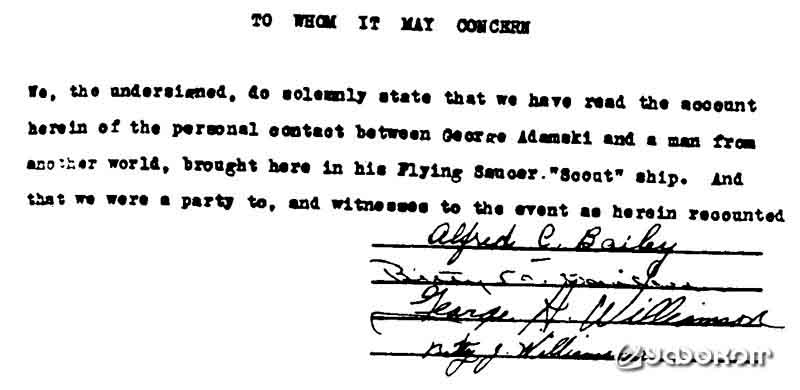Много говорили и о письме Джорджу Адамскому от сотрудника специального комитета Госдепартамента США, которое якобы подтверждало его заявления. Как оказалось, такого комитета не существует, а письмо было подделано уфологами Грэем Баркером и Джеймсом Мосли, чтобы подшутить над Адамским [12].