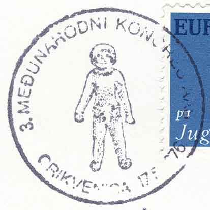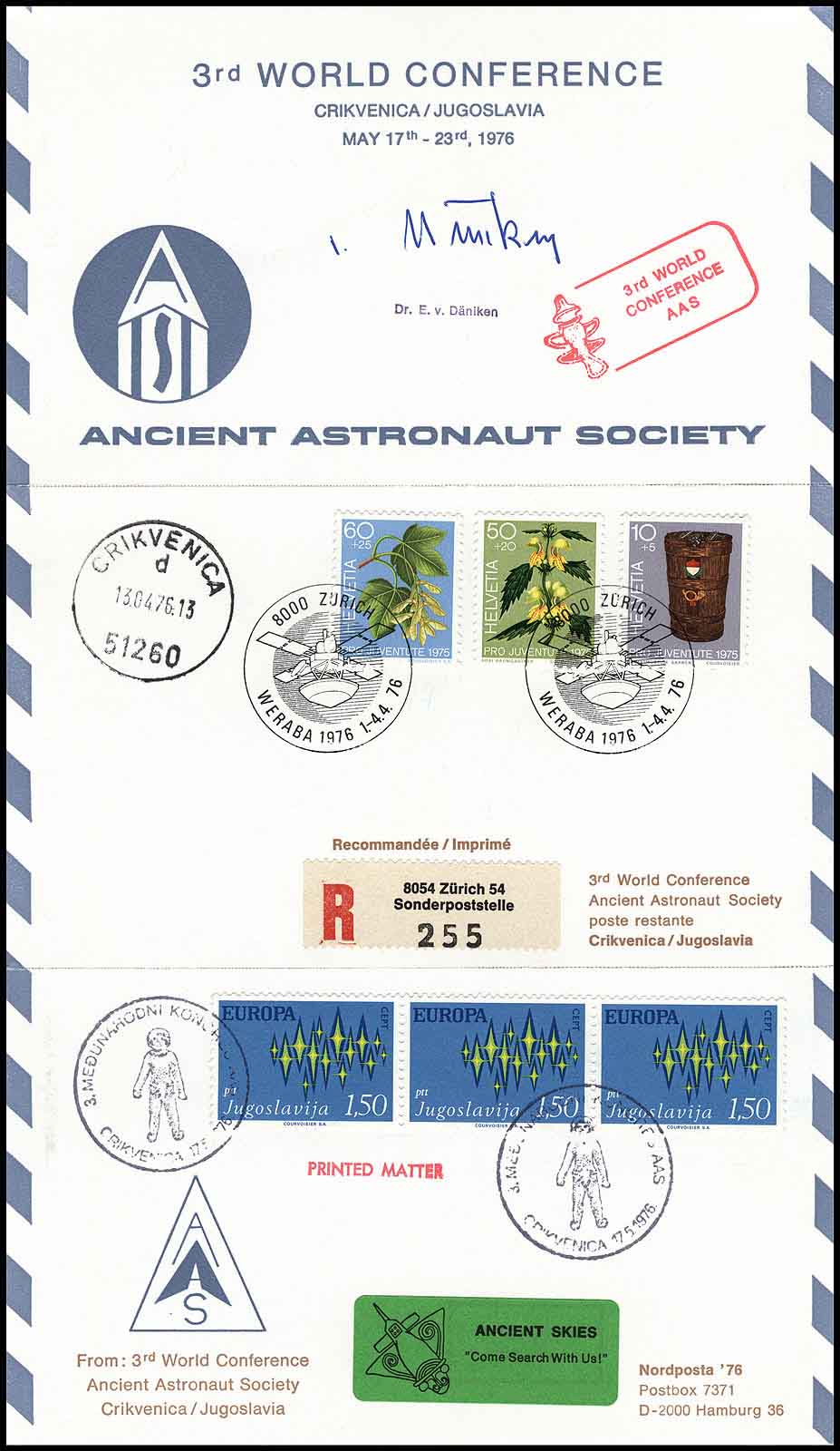 На конверте штемпели: Цюрих, специальный штемпель всемирной выставки «Weraba» (1—4 апреля 1976 года, на штемпеле рисунок американской космической станции «Viking»); календарный штемпель Цриквеницы (13 апреля 1976); специальный штемпель Цриквеницы с надписями «3-й Международный конгресс AAS», «Цриквеница 17.5.1976» и изображением статуэтки, найденной в Эквадоре. Статуэтка изготовлена 7—8 тыс. лет назад. По уверению энтузиастов палеоконтакта, это фигурка инопланетного астронавта, в давние времена посетившего Землю.