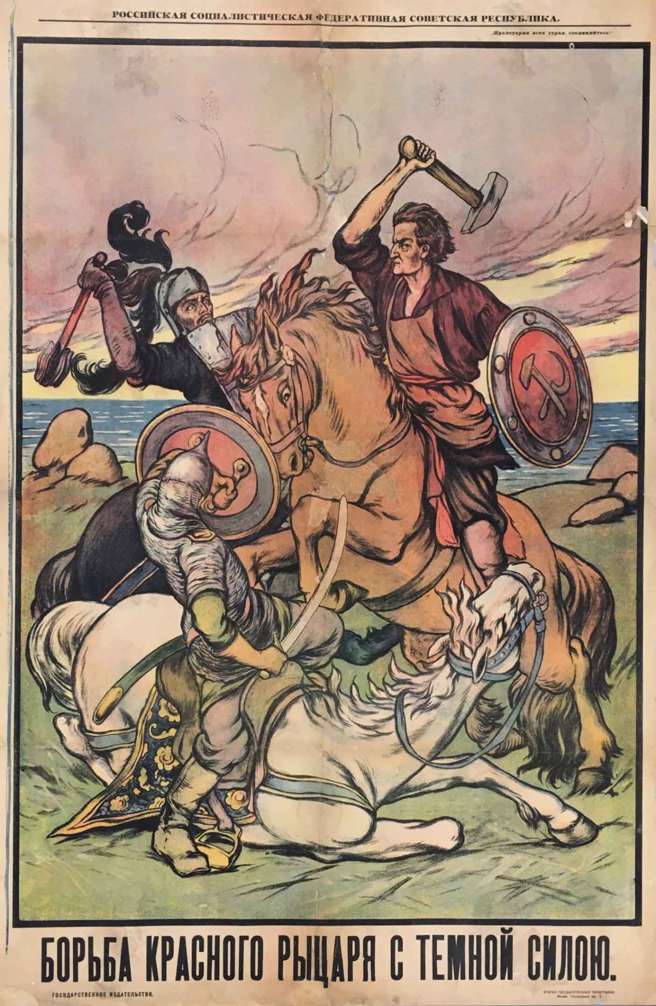 Любопытная подборка, но соглашусь с редакцией — у белых послабее. По поводу второго плаката, который вызвал сомнения: там еще на знамени золотой серп с молотом, которые официально добавили только в 23-м году. Возможно, где-то такое встречалось и раньше, но для плаката имело бы смысл использовать официальную символику, а в годы Гражданской войны официальное знамя было чисто красное. Странно, кстати, что всадников только трое. Война на рыжем коне со шнобелем, рядом Голод на вороном коне и, скорее всего, Чума на белом коне (хотя по черепу это может быть и Смерть, но она традиционно с косой, так что вряд ли). Получается: большевизм — это не смертельно…