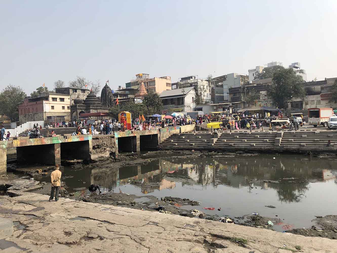 Потом в центре города площадь и Священная Река Годавари. Вроде как вторая по священности после Ганга. Но… не сезон. Ни празднеств, ни омовений. Как оказалось, река сильно обмелела и для всех ритуальных действий воду накапливают специальным шлюзом. А сейчас… чистят. То есть русло почти сухое, работает техника и местные жители, которые бродят по колено в иле и нечистотах и собирают то, что паломники набросали. Также вокруг набережной и прилегающих площадей очень много торговцев «всяким разным». Почему отдельно отмечаю? Потому что во многих случаях вообще непонятно, чем торгуют.