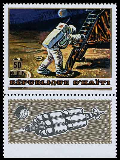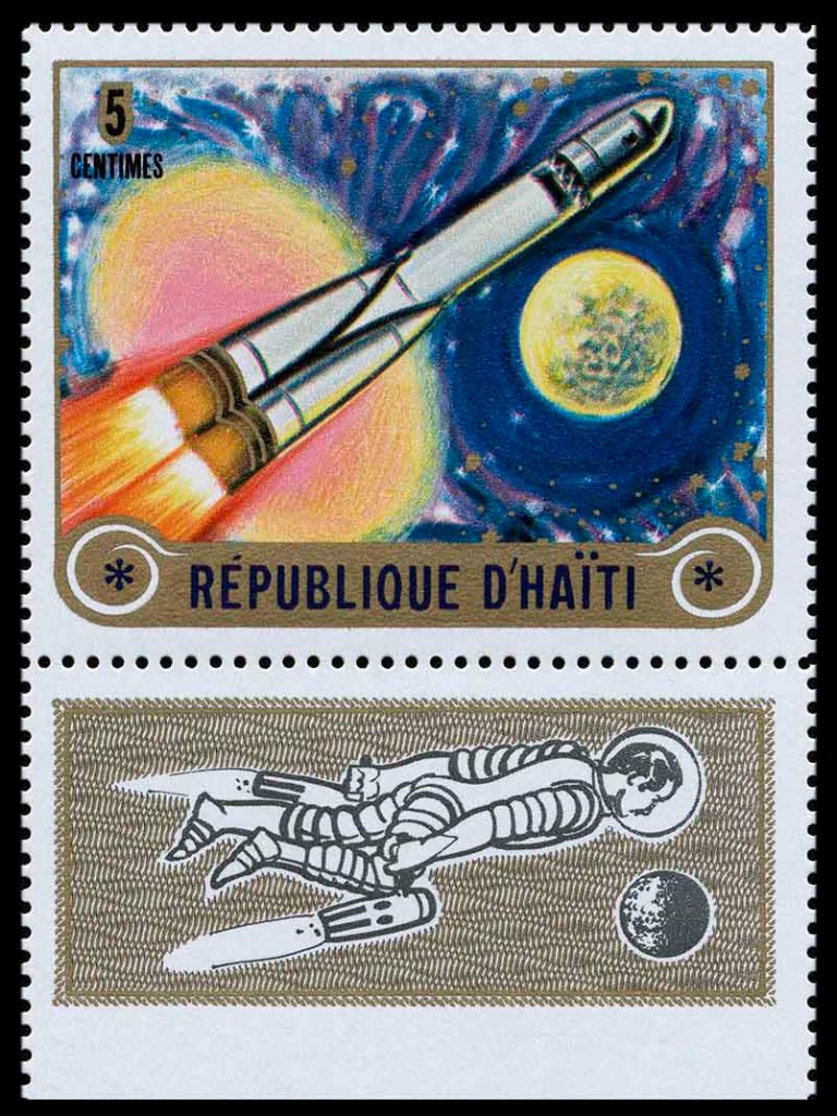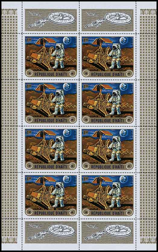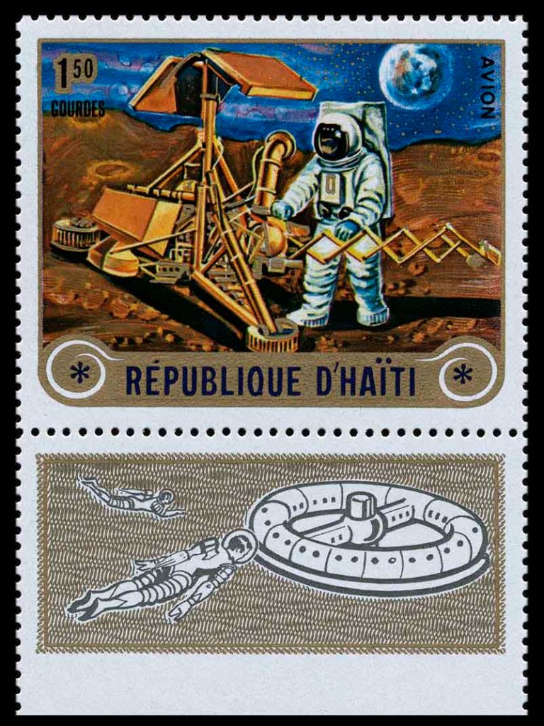 30 марта 1973 года для Гаити была выпущена серия из 12 почтовых марок, посвящённых советским и американским исследованиям космоса. Марки изготовлены в испанской типографии «Heraclio Fournier S. A.» на высоком полиграфическом уровне и дилерам поставлялись в марочных листах 2×4. Поля листов красочно оформлены, золотой и чёрной краской нанесены виньетки и рисунки космических аппаратов и астронавтов — как настоящих, так и будущих.