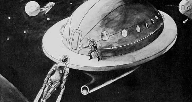 Эта космическая платформа была реакцией одного художника на заявление Министерства обороны, сделанное в 1948 году, о том, что ведутся работы по „Программе спутника Земли“. Распространялось множество неверных сведений. Некоторые утверждали, что аппарат выйдет на орбиту со скоростью 10 000 миль в час — примерно вдвое меньше необходимой, — другие же сообщали о планах создания загадочных смертоносных лучей.
