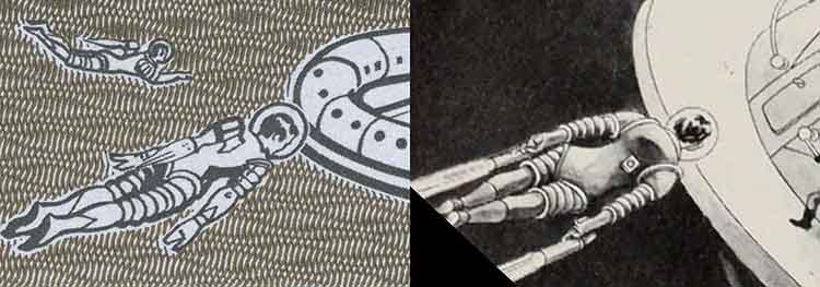 Почему именно из этой книги? Потому что художник, работавший над рисунками марок, совершенно точно был знаком с книгой «Man and Space». Это можно понять, взглянув на поля ещё двух марок — рисунки на них выполнены по мотивам иллюстраций, которые нарисованы специально для книги «Man and Space». Марки с этими рисунками на марочном поле показаны вверху.