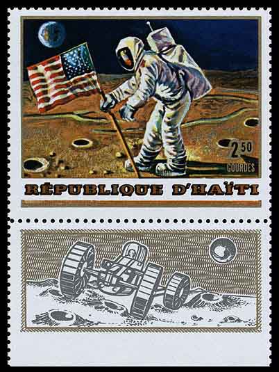 30 марта 1973 года для Гаити была выпущена серия из 12 почтовых марок, посвящённых советским и американским исследованиям космоса. Марки изготовлены в испанской типографии «Heraclio Fournier S. A.» на высоком полиграфическом уровне и дилерам поставлялись в марочных листах 2×4. Поля листов красочно оформлены, золотой и чёрной краской нанесены виньетки и рисунки космических аппаратов и астронавтов — как настоящих, так и будущих.