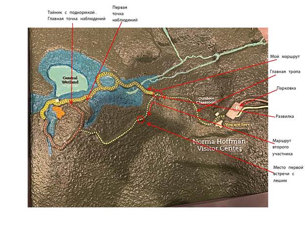 Данный заповедник посещается регулярно три дня в неделю (пятница, суббота и воскресенье) с 2007 года в рамках исследований в области когнитивной этологии для лаборатории физиологии мозга HHMI. Наблюдения проводились (и проводятся) группой из двух человек — автором этих строк и моей женой, д-ром Бэллой Левитиной (врач, физиолог). Главным объектом наблюдений здесь являются два вида цаплевых — большая голубая цапля и американская зеленая кваква. Каждые названные три дня в неделю наша семейная группа движется по заповеднику по одному и тому же маршруту (см. карту на фото 1). По основной тропе (тонкая желтая линия на карте) до развилки. Дальше я продолжаю движение по деревянному настилу над болотом (широкая желтая полоса на карте), а Б. Левитина продолжает движение по основной гаревой тропе в обход болота до тех пор, пока мы не встречаемся в точке, обозначенной на карте как «главная точка наблюдений». Как было упомянуто, по этому маршруту мы движемся три дня в неделю в течение вот уже 13 лет (с 2007 года) и, следовательно, зрительно знаем каждое дерево, каждую ямку на этом пути.