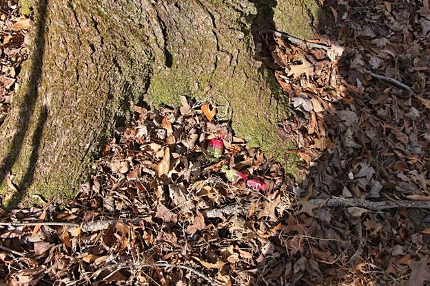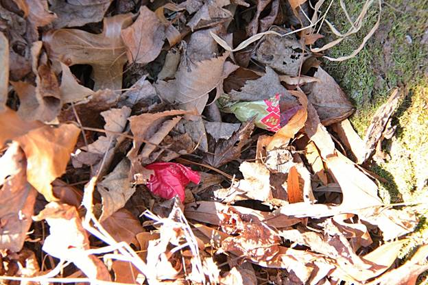 Поэтому на следующий же день, 1 января 2017 года рядом с обнаруженной постройкой я положил в качестве прикормки три конфеты, три соевых батончика в фантиках Бабаевской кондитерской фабрики. Именно в фантиках, чтобы понять, есть ли руки у того, кто возьмет эту прикормку. Поскольку прикормка животных в этом парке строжайше запрещена, тайник с конфетами пришлось делать скрытно и непосредственно на земле. Прикормка была уложена между корнями дерева и закрыта слоем опавших листьев (фото 5).