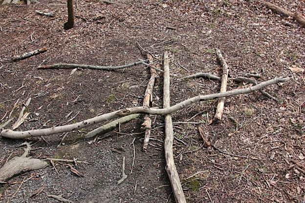 Подобных элементов в постройках моего подопечного до сих пор не встречалось. Сразу возникло подозрение в том, что здесь поактивничали дети обычные, человеческие. Непонятными представились также два момента. Первый — это постройка в 40 метрах в глубине леса высотой четыре метра с несколькими поперечными палками (фото 31).