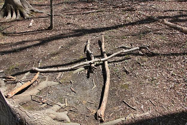 И еще раз по поводу арки, появившейся в октябре 2017 года и изображенной на фото 15 выше. Арка простояла вплоть до 31 августа 2019. В течение 3 лет казалось, что соорудивший ее давно о ней забыл. Однако оказалось, что это совсем не так. После того как арка простояла нетронутой в течение трех лет, ночью с 30 на 31 августа ее развернули. Если вечером 30 августа она была, как всегда, ориентирована вдоль тропы, то утром 31 оказалась ориентированной поперек тропы так, что конец дерева был заведен за ствол другого дерева на противоположной стороне тропы (фото 36).