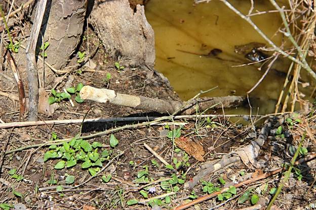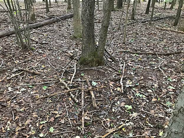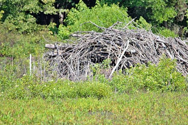 Единственным признаком его присутствия на этой территории летом 2017 был лишь следующий момент. За четыре года до описываемых событий вне территории заповедника проводились работы по расчистке ручьев, питающих это болото. Все сухие деревья с берегов ручьев свезли на территорию заповедника и сложили в виде больших куч — как было официально объяснено, для удобства животных, населяющих парк. Такие кучи сухих деревьев были образованы и посреди болота, и на лесных территориях. И вот, в один из дней проходя мимо одного из таких навалов, я увидел возникшее в нем отверстие наподобие амбразуры (фото 14).