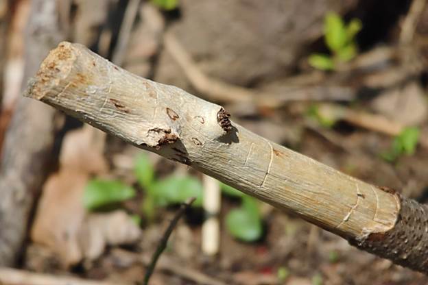 И больше за весь летний период 2016 года ни одного проявления присутствия предполагаемого примата в этом месте обнаружить не удалось. Позже, уже в апреле 2019 года была обнаружена еще одна палка с оформленной рукоятью (фото 12) со следами, на первый взгляд, ножа (каменного?). Однако при ближайшем рассмотрении оказалось, что инструмент был использован с тупым режущим краем — скорее всего, это было сделано зубами (фото 13).