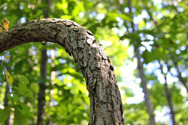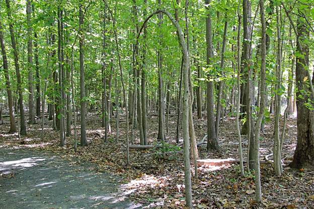 Первые признаки подозрительного присутствия в заповеднике были замечены летом 2016 года, когда, возвращаясь по основной тропе к парковке, я периодически стал слышать шаги за спиной. При этом никого, следующего за мной, увидеть не удавалось. Сам по себе этот факт вряд ли вызвал бы какой-то интерес, поскольку звук шагов на гаревом покрытии может как угодно отражаться от окружающих деревьев и создавать эффект преследования. Этот феномен хорошо известен и в обычной ситуации вряд ли привлек бы мое внимание. Но в данном случае возникновение этого эффекта удивительным образом совпадало с пасмурной погодой, когда окружающие предметы не отбрасывают тени. И, второе совпадение, в эти же дни я стал замечать появление тонких деревьев, согнутых в виде арки (фото 3). Особенность этих арок в том, что появлялись они внезапно (вчера не было, а сегодня появилась) и без каких-либо погодных предпосылок. Несколько таких арок я сфотографировал и послал для консультации Михаилу Самойловичу Трахтенгерцу (светлая память). М. Трахтенгерц пришел к выводу, что арки похожи на признаки присутствия дико живущего примата, и рекомендовал продолжить наблюдения.