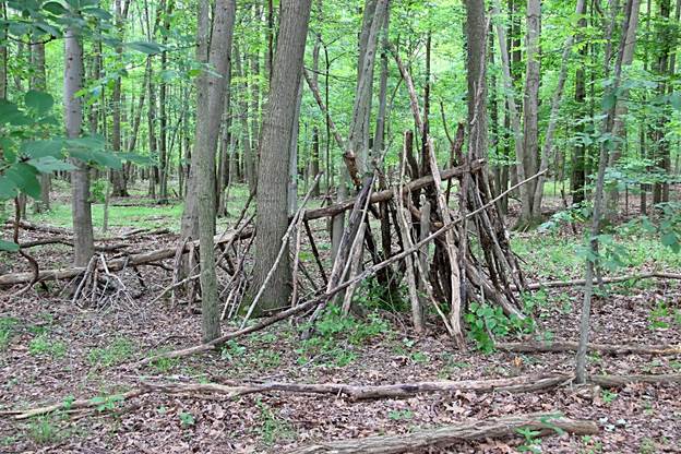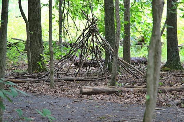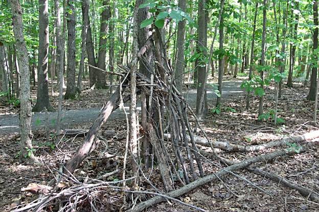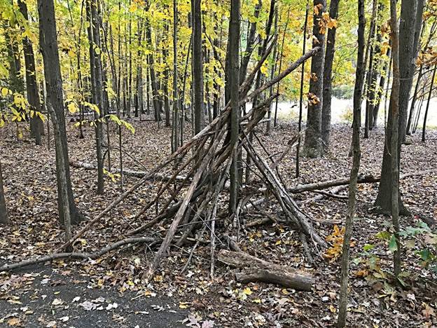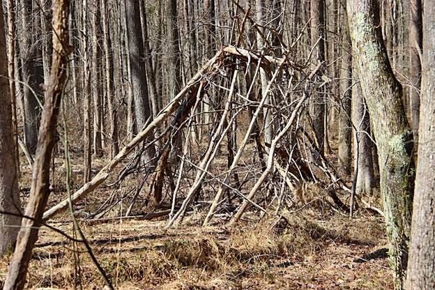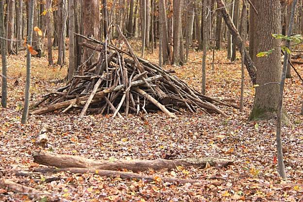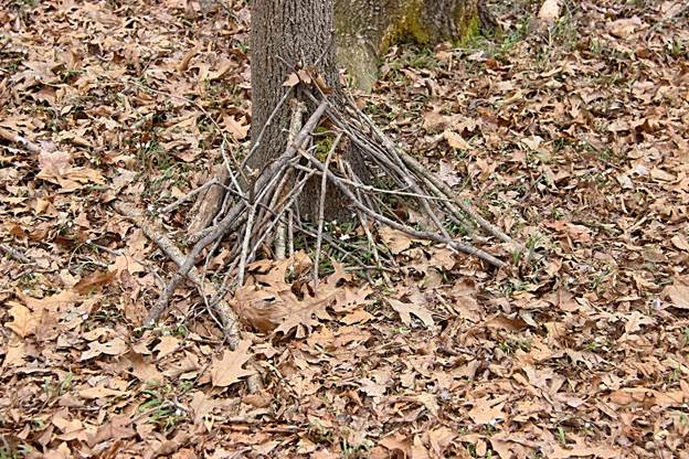 Можно было бы предположить, что играли обычные человеческие дети. Однако, во-первых, ночью, когда появились эта постройка, людей в заповеднике нет. Во-вторых, когда дети что-то разрушают, то обычно разбрасывают строительный материал по сторонам, поскольку кидаться палками для ребенка — это особое удовольствие в процессе разрушения чего-либо. И, в-третьих, в летнее время детям здесь сходить с тропы не разрешают из-за опасности, которую представляют ядовитые змеи. Здесь в США родители за этим смотрят очень строго. А позже, уже в октябре появился другой шалашик, теперь с другой стороны от тайника с угощением (фото 24). И тоже детского размера, тоже с дырявыми стенами и тоже без входа/выхода.