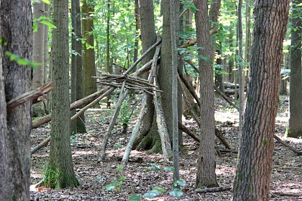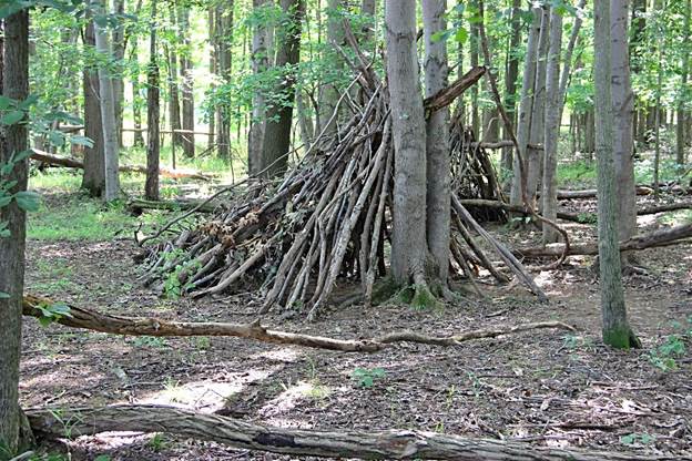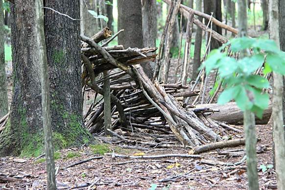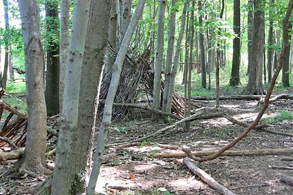 Совсем интересное событие произошло в конце июля 2019 года. В этот день, 26 июля, не доходя тридцати метров до тайника с прикормкой на площадке в точке, обозначенной на карте как «первая точка наблюдений», я обнаружил целых!!! 7 шалашей, очень похожих на те, которые раньше мне строил мой подопечный (фото 28). Очень похожих, но не совсем похожих. Шалаши были разных конструкций, но все отличались наличием четко очерченных входов\выходов и плотными непрозрачными стенами.
