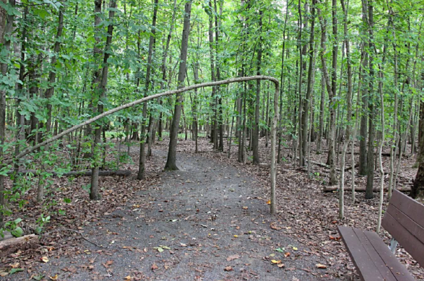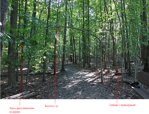 Следующие свидетельства деятельности нашего объекта появились лишь осенью в октябре 2017 года. В одно из посещений заповедника уже в третьем месте, которое на карте обозначено как «главная точка наблюдений», находящемся в 30 метрах от «первой точки наблюдений», вплотную к тропе также рядом со скамейкой была обнаружена арка из согнутого дерева (фото 15).