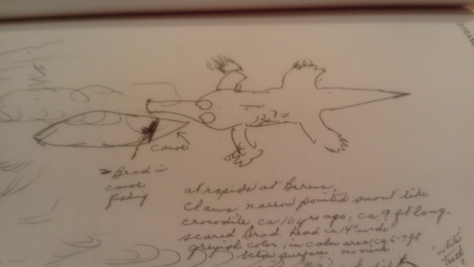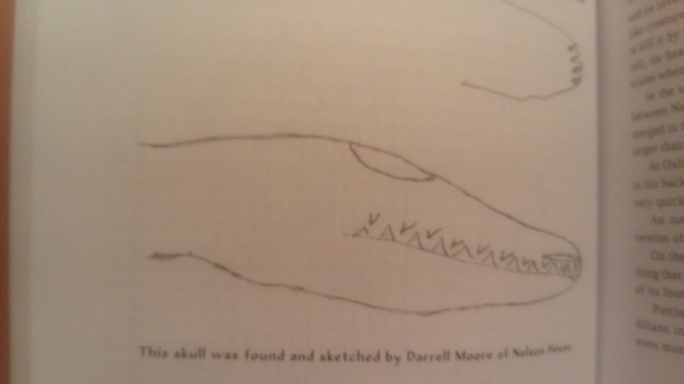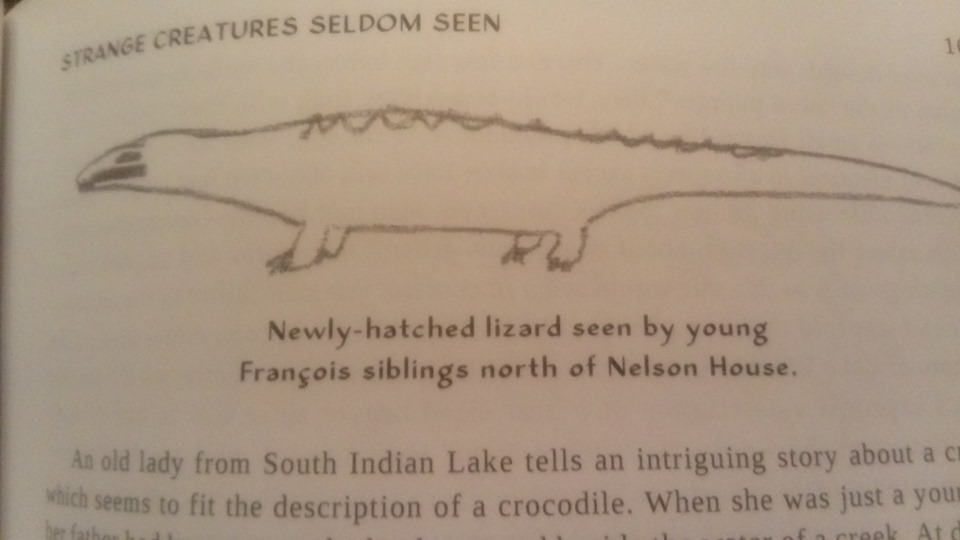 Нам известно про саламандр и ящериц на юге Канады, про аллигаторов и крокодилов на юго-востоке Соединённых Штатов, но разве кто-то слышал о крокодилообразных в тех районах Канады, где лёд зимой настолько толстый, что по нему ездят грузовики со снабжением для отдалённых общин? Тем не менее мне приходилось о них слышать в своих поездках. Впервые я услышал об этих существах в Норвей-Хаус (Norway House) на севере озера Виннипег. Однажды охотник, как мне сказали, вырубил изо льда ручья замерзшего там шестифутового крокодила (или ящерицу). Это было ещё до Первой мировой войны. Затем брат с сестрой из Нельсон-Хауса (Nelson House) рассказали о своём детском воспоминании: как-то летом их семья плыла на каноэ к местам зимней охоты, и по пути, к большому удивлению, они заметили на травянистом берегу норы с ползающими вокруг крокодильчиками. Внутри этих нор (полтора фута глубиной и фут в диаметре) были как расколотые яйца, так и пока целые длиной около пятнадцати сантиметров и диаметром около десяти.