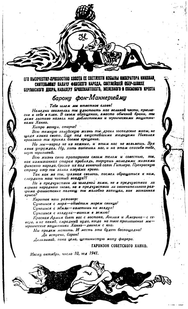 Перед нами реальная листовка советского гарнизона полуострова Ханко (Гангут), выпущенная 10 октября 1941; авторы текста — двое бойцов этого гарнизона, будущий известный фантаст Евгений Войскунский и уже тогда довольно известный поэт Михаил Дудин.