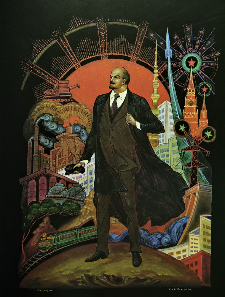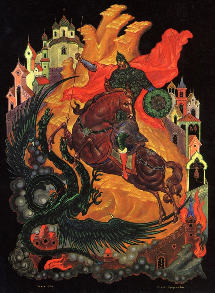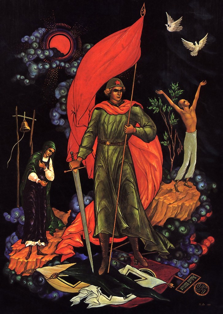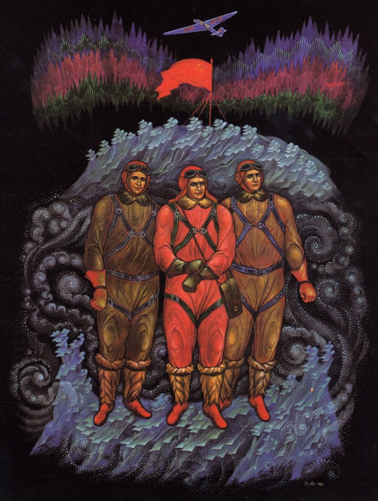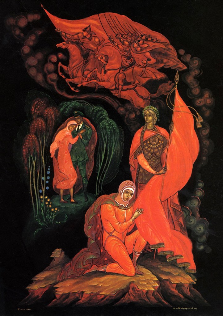 Цикл работ, о котором пойдет речь, принадлежит трем палехским художникам, хотя в описании обычно упоминают только двух, супругов Кукулиевых; но, кроме них, в создании цикла участвовал еще и Олег Ан, хотя он подключился на последнем этапе, в 1981 г. Работа длилась долго, с 1977 по 1981 годы, и представляла собой в общем-то не характерное для палешан сочетание книжных иллюстраций большого (огромного!) формата и классических пластин. Полностью вся серия была опубликована еще через год после завершения в виде книги-альбома «Сын России»: подарочного вида, потрясающего качества — и… довольно малым по тем временам тиражом 50 тыс. экз., так что теперь это издание можно найти лишь у редких любителей, а в Сети из него выложены лишь фрагменты1. Литературная часть принадлежит руке Альберта Лиханова (писателя очень титулованного, но при этом весьма небезынтересного), однако о ней сейчас говорить не будем: текст состоит словно бы из почти абстрактного набора фраз, почти никак не сочетающегося с иллюстрациями, и, видимо, появился только потому, что издательство «Молодая гвардия» в 1982 г. не совсем представляло, как это можно издать книгу, состоящую только из «картинок».