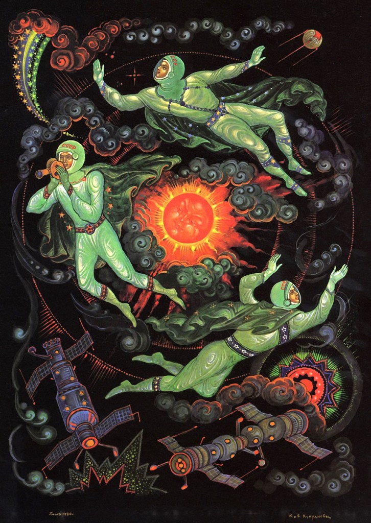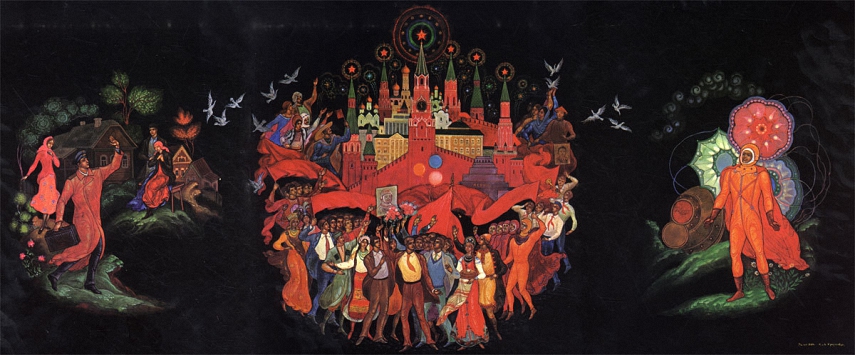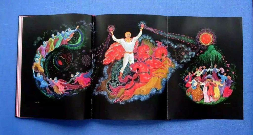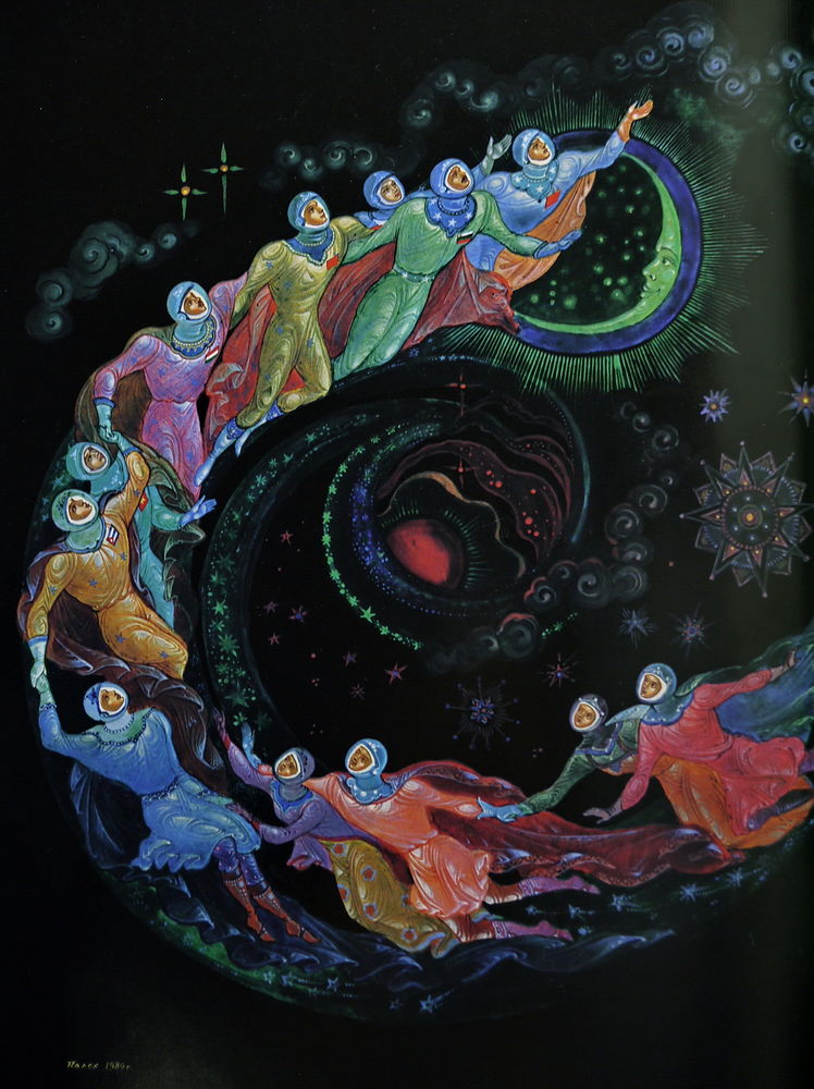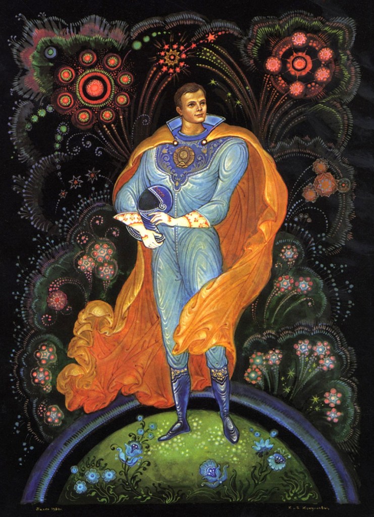 А «картинки» эти, 4 больших (даже в альбоме громадного формата 70 х 100 1/8 их пришлось укладывать складным «триптихом») и 25 обычных, являют собой… житие Юрия Гагарина — именно в том смысле, в котором мы говорим о житиях святых. Конечно, с поправкой на советскую концепцию. Но с поправкой ли, без нее ли — новый вариант иконописного канона: в центре — ковчег со средником (иначе расположенным и иногда более многофигурным, чем на традиционной иконе, ну так палехская живопись к концу 70-х долгую эволюцию проделала), вокруг — клейма с житийными деяниями, тоже более насыщенные и самостоятельные, но узнаваемые. И при этом фантастические… что, впрочем, для иконописи не новость. Вот только в данном случае фантастика посвящена покорению космоса и мечтам об этом. С условно древнерусских, былинно-сказочных времен до эпохи Гагарина… и вперед, в будущее.