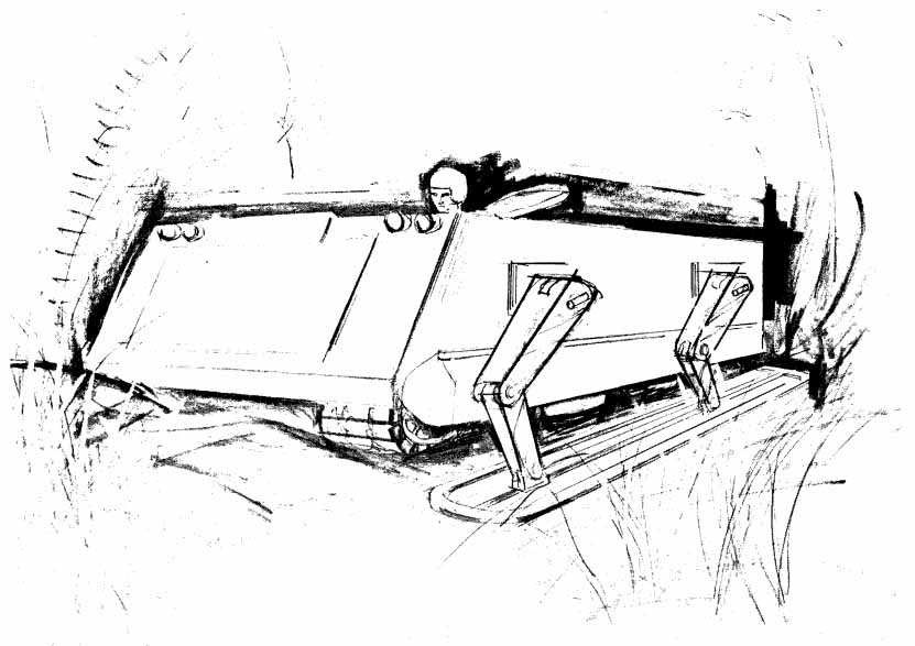 б) Интересна стопа, предложенная Чебышевым. Она имеет в сечении прямоугольник, но направлена вовнутрь, к другой стопе. Во-первых, повышается площадь опоры по сравнению с квадратом. Во-вторых, возможно введение дополнительных ребер, повышающих прочность самой опоры, не увеличивая при этом габариты машины. В-третьих, в случае полевого ремонта стопа, размещаясь под корпусом, понижает вероятность того, что шагоход кувырнется на бок. В чистом виде машина Чебышева вообще может устойчиво стоять на трех ногах.