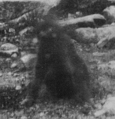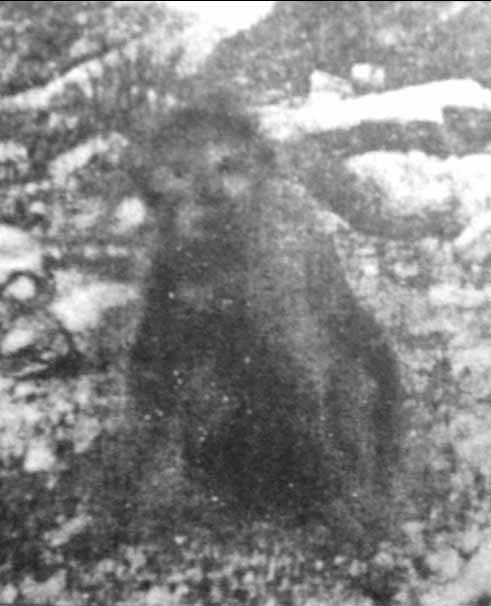 Как видим, это просто-напросто расфокусированная фотография сидящей собаки — с пятнами над глазами, опущенной темной мордой и высунутым языком. Потом кто-то «присобачил» к ней изображение головы, напоминающей (во всяком случае, по мнению фальсификатора) лик снежного человека.