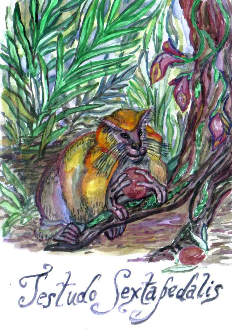 Testudo Sextapedalis не является черепахой и не обладает тремя парами конечностей. Столь странное название дали ей жители Сулавеси. Наблюдать это животное в естественной среде обитания очень непросто: оно предпочитает те уголки джунглей, где растительность максимально густая, а значит, практически непроходима для человека. Редко кто из охотников забирался в такую глушь. Замечая нечто, медленно движущееся на четырех ногах, придерживая перед мордой пищу, они полагали наличие у этого создания шести лап. Если недалеко от места, где был замечен зверь, счастливчик находил кладку яиц, он нес свою добычу в поселок, чтобы приготовить омлет для себя или нуждающихся соплеменников. Согласно верованиям островитян, это блюдо помогает сохранить молодость и мужскую силу.