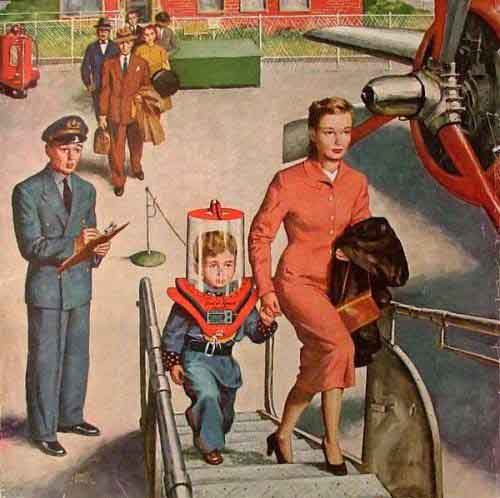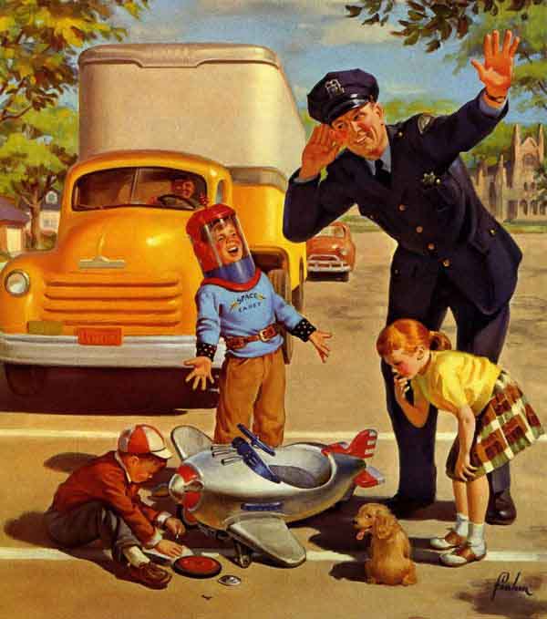 А это иллюстрации к обложкам журнала «The Saturday Evening Post» за 1954 год. Автор их — Амос Сьюэлл (Amos F. Sewell), 1901—1983. Любопытно, что перед нами вообще-то не фантастика и не футурология, хотя первая картинка и называется «Космический путешественник» (а до выхода в космос чего бы то ни было остается еще несколько лет). Просто такие маски-шлемы как детали детских игровых костюмов тогда были в моде — и юный «путешественник», как видно, настолько заигрался, что не согласен шлем снять ни в самолете, ни перед полисменом. Последний, как и вынужденные остановиться водители, относится к этому в высшей степени снисходительно: в мире Полудня, даже американского, действует принцип «Дети — наше будущее!»…