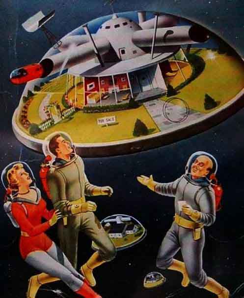Риелтор — он и в космосе риелтор. Последняя иллюстрация в нашем списке датируется 1953 годом и незамысловато называется «Дом будущего». Изначально это, похоже, был какой-то рекламный постер: авторство установить не удалось. Забавно, что первая его публикация применительно к книжной фантастике — мягкая обложка одного из ранних изданий романа «Синдик» Сирила Корнблата, который абсолютно не о том и вообще чрезвычайно мрачен, фактически представляет собой антиутопию (в американском Полудне это направление не было под запретом).