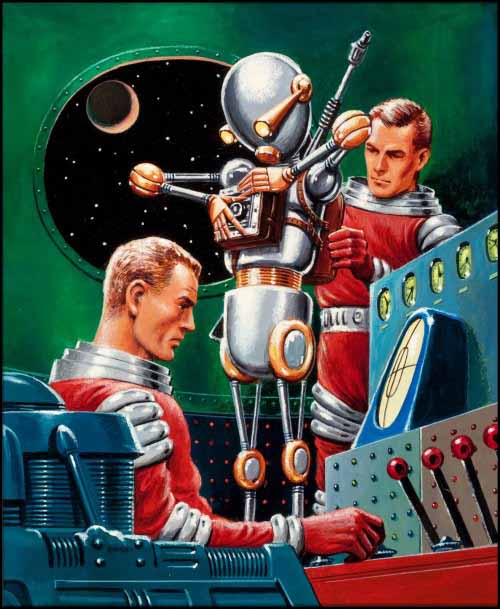 Это касается и данной иллюстрации, созданной в 1953 году в двух разных вариантах: на первоначальном робот лишен космической винтовки (или что там у него за плечами) и поэтому стоит перед одним из астронавтов, как стояла бы на табуретке маленькая девочка, которой внимательный отец перед выходом на улицу косички заплетает… причем астронавт (правда, другой) лицом похож на самого Эмшвилера. Вообще-то известно, что Эду регулярно позировали члены его семьи (жена, брат, трое детей — все из которых пошли в фантастику: кто сценарист, кто художник и писатель), так что, похоже, соответствующую роль сыграла его старшая дочь Эва, которой на тот момент еще не исполнилось пять годиков.