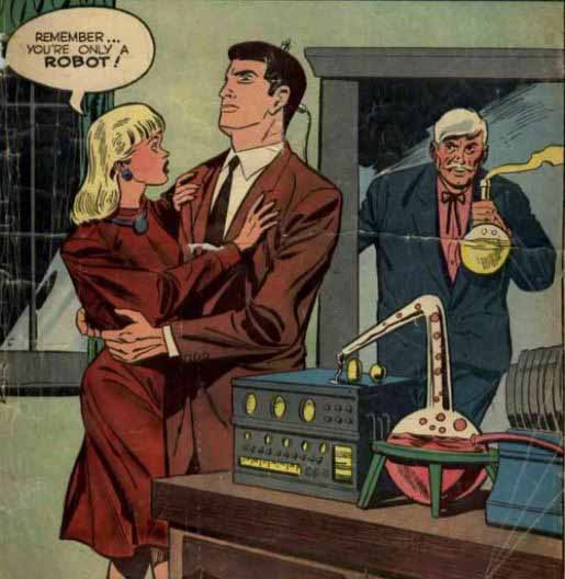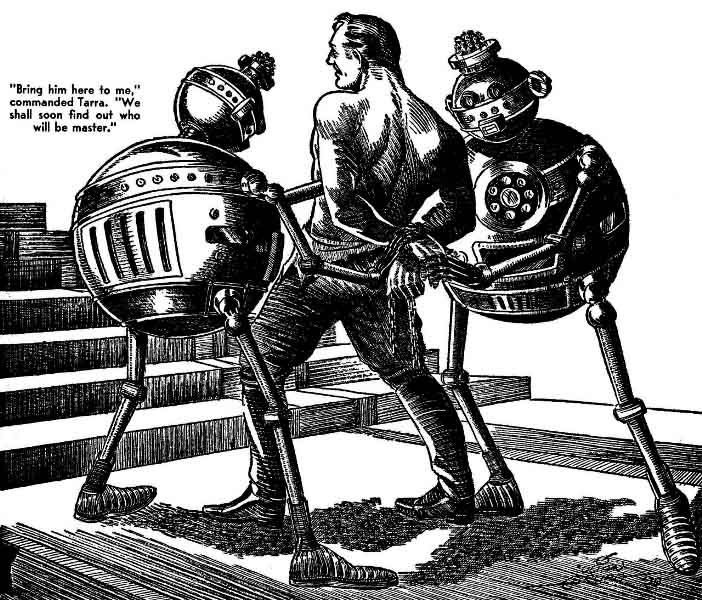 Та Тарра, к которой пузатые стражники приводят скованного повстанца, — идеальная женщина, правительница всея Земли. Роботы сумели ее убедить, что они с проблемами человечества справятся лучше, чем оно само… но вскоре идеальный мужчина (нет, на рисунке не он) объяснит ей, что все обстоит не так и власть роботов надлежит свергнуть. Так что на самом деле роман следовало бы назвать «Восстание против роботов»…