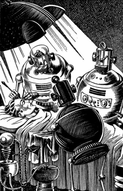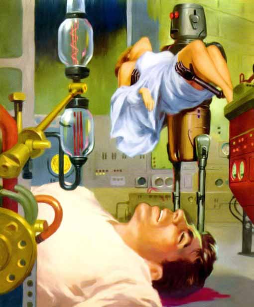Вот его же работа следующего года (опять-таки с собственным сюжетом, не иллюстрация в строгом смысле слова), регулярно использовавшаяся в фантастических обложках, — «Срочный ремонт андроидов в присутствии заказчика»: