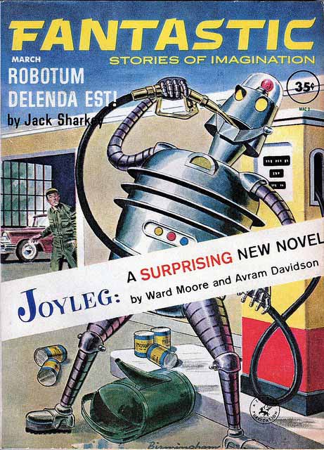 Это изображение иллюстрирует рассказ Джона Майкла Шарки, работавшего под полупсевдонимом Джек Шарки (Jack Sharkey). Автор типа Шекли, регулярно бравшийся за мрачные сюжеты, но скрашивавший их мягкой иронией. Мог бы оставить в фантастике очень глубокий след, однако эпоха его сотрудничества с «Amazing Stories» и другими изданиями приходится в основном на 60-е годы. После чего он фантастике-то верен остался, но вот литературе — нет, переключился на мюзиклы. Над ними Шарки тоже работал в стиле Шекли, добавляя улыбку даже в столь мрачные истории, как адаптации к бродвейской сцене «Джекила и Хайда» и «Призрака оперы»). А еще он автор знаменитой формулы «It’s Magic!» как иронической «отмазки» для фэнтезийных сюжетов.