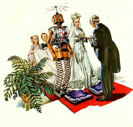 В действительности перед нами не фантастика и даже не совсем футурология, а изображение символического брака промышленности (прекрасная невеста, в чьем взгляде проглядывает сомнение и грусть) и электроники (сияющий улыбкой «новодел», пока выглядящий чудовищно, но с блестящим будущим). Тогда, в 1947 году, для читателей, да и промышленности необходимость такого брака еще отнюдь не была очевидна, приходилось их убеждать. Статья (в уже известном читателям «Горизонта» великолепном журнале «The Saturday Evening Post») так и называлась: «Marriage of Industry and Electronics».