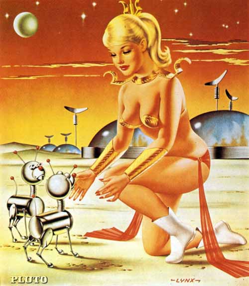 Это лист из американского научно-фантастического календаря («Sci-fi calendar») за 1965 год. Называется картинка «Собачки на Плутоне» («Canines on Pluto»), автор иллюстрации скрылся под псевдонимом Lynx, то есть «Рысь», выяснить подробности не удалось.