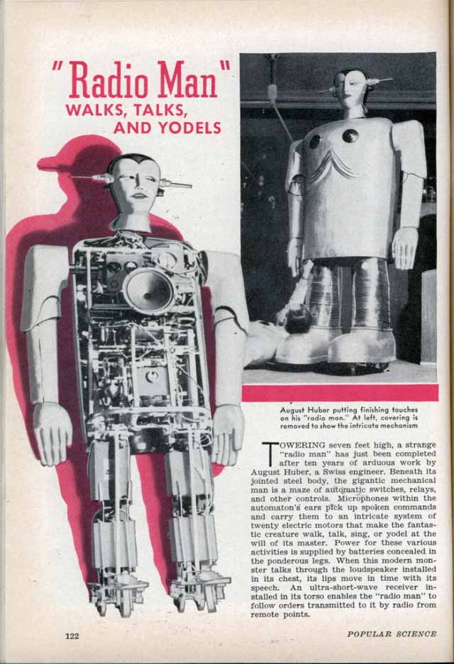 Но вернемся к плеяде «электромеханических людей» довоенной поры. Самым ярким примером в ней стал американский робот «Мистер Электро», созданный компанией Westinghouse Electric Corporation в 1937 году, два года спустя торжественно открывший Всемирную выставку 1939 года в Нью-Йорке, а еще через год получивший «напарника»: робособаку Спарки. Он ходил, говорил (словарный запас — 700 слов) и даже курил: тогдашние представления о здоровом образе жизни отличались от нынешних.