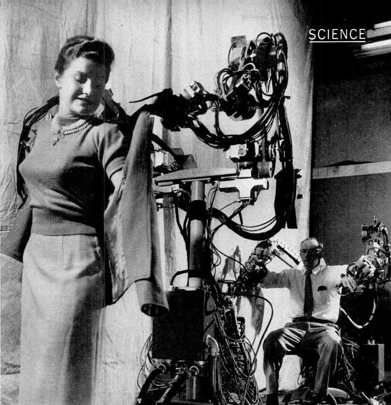 На тот момент даже наиболее склонные к антропоморфизму конструкторы осознали, что для пригодных к практической работе роботов нет нужды имитировать движения человеческих конечностей и даже язык: куда важнее возможность выполнять простые рабочие процессы. Впрочем, иногда одно не мешало другому. В 1950-х годах американская фирма GE (GENERAL ELECTRIC COMPANY), специализирующаяся на выпуске управляемых манипуляторов (в некоторых случаях даже автоматических, но еще без кибернетической «начинки»), создала «линейку» из нескольких десятков моделей, используемых в промышленности, причем некоторые из них повторяли человеческие движения. Эта серия продолжала совершенствоваться вплоть до начала 1970-х, но в поздних версиях человекоподобия стало поменьше, да за ним уже и не гнались. А вот в 1956 году «Телеоператор», один из так называемых «GE-роботов», отлично прорекламировал компанию, продемонстрировав, что может действовать не только в горячем цеху или в зоне радиоактивного заражения, но и в гардеробе, принимая и подавая пальто.