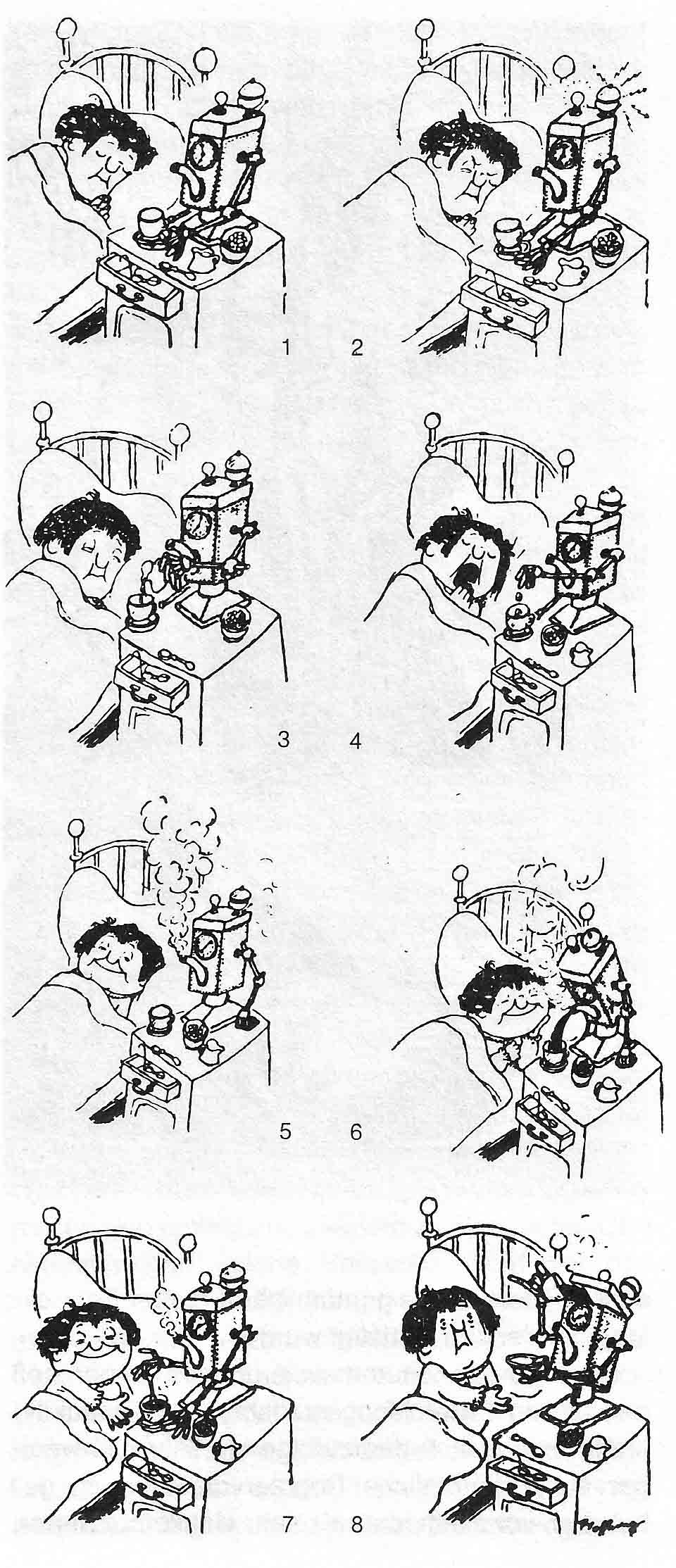 Осталось только грустно шутить по поводу недавнего энтузиазма. Классический пример такой шутки — популярная в 1950-х годах карикатура «Обманутые надежды», на которой роботизированный будильник, совмещенный с кофеваркой, жестоко обманывает ожидания своей хозяйки: