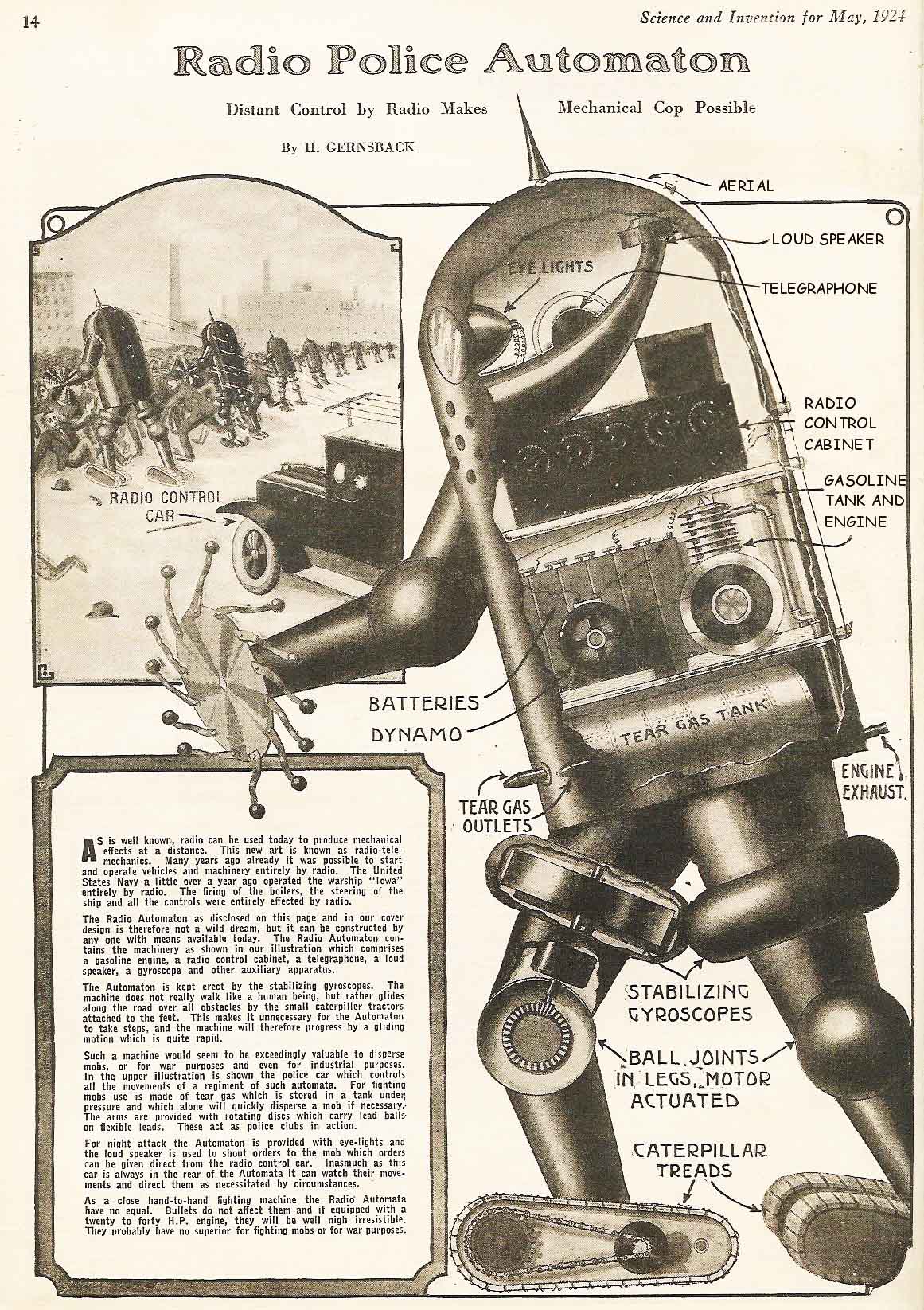 Любопытно проследить за вкладом в тему, сделанным Хьюго Гернсбеком, который основной след все-таки оставил в истории фантастики. При этом в 1920-х годах Гернсбек много размышлял о развитии новых технологий, принимал участие в издании ведущих научно-технических журналов и сам писал для них статьи. Среди его замыслов — опубликованный в журнале «Science & Invention» за май 1924 года проект робота-полицейского, который, в других модификациях, может быть использован и для военных нужд. Такой уж фантастикой это тогда не выглядело: радиоуправляемая техника тогда уже была известна, а разум ей никто придавать и не собирался — все должно было происходить под контролем человека. Примечательно и то, что полицейская модификация, предназначенная для оттеснения и рассеивания мятежных толп, обгоняет военную: угроза глобальной войны в те годы вполне могла реализоваться, но угроза глобальной революции пугала куда больше…