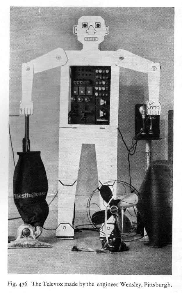 Продолжим разговор о так называемых механических людях, творениях инженерной мысли первой половины ХХ века. Одним из наиболее ярких примеров машин этого поколения был «Телевокс», разработанный американским конструктором Роем Джеймсом Венсли. В 1927 году «Телевокс» впервые появился на публике как домработник, повинующийся голосовым сигналам — как по телефону, так и «вживую», только в обоих случаях надо было не произносить слова, а нажимать клавиши аппарата, издающего гудки определенной тональности. У части этой публики даже сложилась иллюзия, будто этот электрический домработник может не только принять команду и передать ее аппаратуре «умного дома» (конечно, с поправкой на возможности 1927 года), а действительно своими ногами подойти и своими руками выполнить работу…