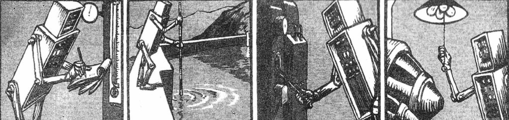 Всех не перечислишь: достоверно известных роботов в 1920—1930-х годах — многие десятки, да еще и какое-то количество под сомнением. Многие действительно были пиком тогдашних технологий, другие выполняли совсем простенькие действия. Среди этих последних — знаменитый (пускай не благодаря своим возможностям) «Джентльмен из листового металла» конструкции инженера Ф. Дж. Эдвардса, представленный на Британской промышленной выставке в Бирмингеме, 1930. Его фотографии разошлись по многим изданиям, вдохновили многих иллюстраторов — и на несколько лет сделались карикатурным эталоном «железного человека». А через четверть века берлинский карикатурист Эрих Шмитт, опираясь на все еще остающееся памятным название, начал работу над иллюстративным циклом о жизни людей и роботов «Коллеги из листового металла», который задал новую версию этого эталона… но теперь тоже полузабыт.