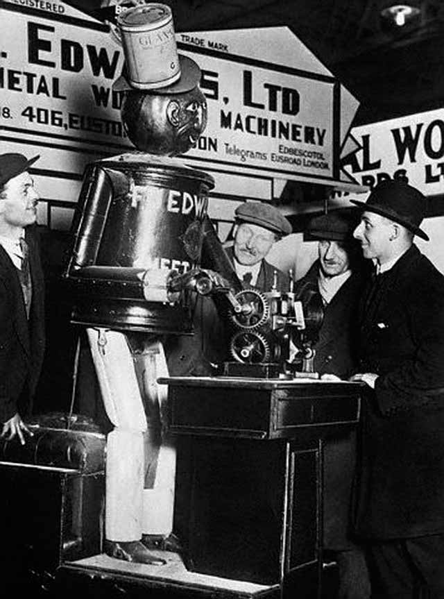 (А. Дж. Робертс — человек, жизнь которого достойна отдельной статьи. Новозеландец по рождению, что на тот момент означало — британец, капитаном он был настоящим, участвовал в Первой мировой войне, но еще до нее пытался разработать разные варианты автоматической техники, включая электроуправляемый дирижабль. Его послевоенные электромеханические автоматы главным образом были эффектными в коммерческом смысле рекламно-развлекательными поделками, с помощью которых он пытался — и небезуспешно! — зарабатывать деньги на практически применимые проекты: дистанционно управляемые электромобили, самолеты, «авиационные торпеды»… Однако эти его идеи слишком обогнали время, поэтому, как ни парадоксально, одним из главных достижений Робертса стало «закрепление образа» робота.