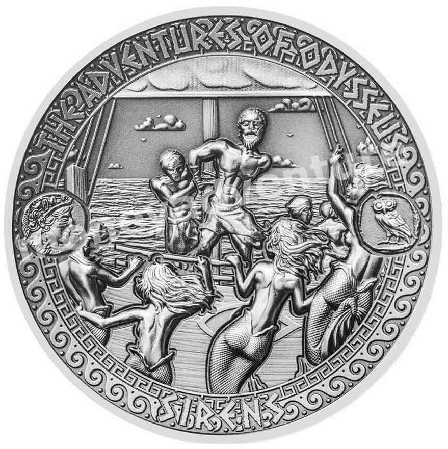 Вот только с хитрым Одиссеем сирены просчитались. Когда его корабль проплывал рядом с их островом, ощетинившимся каменными пиками, тот приказал спутникам заткнуть свои уши воском, а его самого крепко привязать к мачте судна (уж очень ему не терпелось услышать волшебное песнопение морских химер!). В итоге сам Одиссей чуть не сошел с ума. Однако его «лишенная слуха» команда сумела справиться с опасной ситуацией. Как раз этому их подвигу посвящена и одна из современных коллекционных монет из серии «Путешествия Одиссея»…